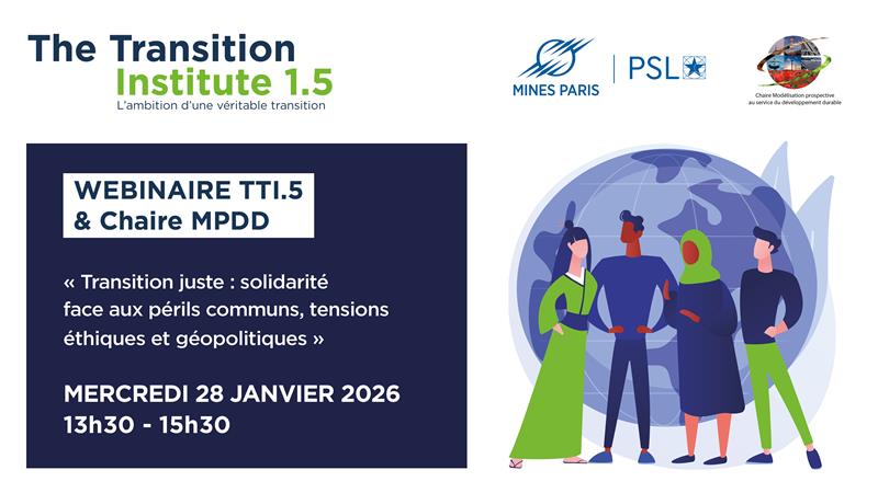 La Chaire Modélisation prospective au service du développement durable et The Transition Institute 1.5 (TTI.5) ont le plaisir de vous convier à un webinaire sur la thématique « Transition juste : solidarité face aux périls communs, tensions éthiques et géopolitiques »